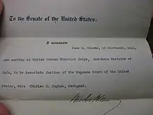 In June 1916, a vacancy arose on the Supreme Court when Associate Justice Charles Evans Hughes resigned to accept the Republican nomination for President. Wilson wanted to fill the seat by appointing his Attorney General, Thomas W. Gregory, but Gregory demurred and suggested Clarke instead.[9] After having Newton Baker (Wilson's Secretary of War and a close friend of Clarke's) speak with Clarke to confirm his opposition to trusts,[10] Wilson offered Clarke the nomination. Though Clarke was reluctant to abandon trial for appellate work, he felt he could not pass on such an honor and accepted. Wilson sent his name to the Senate on July 14, 1916 and Clarke was confirmed by the United States Senate unanimously ten days later.