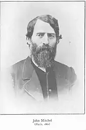 John Mitchel (Irish: Seán Mistéal; 3 November 1815 – 20 March 1875) was an Irish nationalist activist, author, and political journalist. In the Famine years of the 1840s he was a leading writer for the Nation produced by the Young Ireland group and their splinter from Daniel O'Connell's Repeal Association, the Irish Confederation. As editor of his own paper, the United Irishman, in 1848 Mitchel was sentenced to 14-years penal transportation, penalty for his advocacy of James Fintan Lalor's programme of co-ordinated resistance to exactions of landlords and to the continued shipment of harvests to England. Controversially for a republican tradition that has viewed Mitchel, in the words of Pádraic Pearse, as a "fierce" and "sublime" apostle of Irish nationalism,[1] in the American exile into which he escaped in 1853, Mitchel was an uncompromising pro-slavery partisan of the Southern secessionist cause. In the year he died, 1875, Mitchel was twice elected to British Parliament from Tipperary on a platform of Irish Home Rule, tenant rights and free education, and twice denied his seat as a convicted felon.