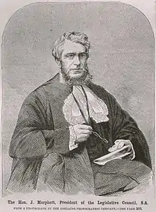 Morphett was appointed treasurer to the town corporation on 5 December 1840, and on 15 June 1843 was nominated as one of four non-official members of the expanded South Australian Legislative Council. In January 1845 he chaired the meeting called to protest the British government's proposal to send Parkhurst prison boys to South Australia. In September 1846, as a protest against the mining royalty bill being passed by the casting vote of Governor Robe, Morphett and the three other non-official council members left the chamber – in consequence the council was left without a quorum. In August 1851 Morphett became Speaker of the enlarged Legislative Council, and on 9 March 1857 he was elected a member of the legislative council at the first election under responsible government. He was chief secretary in the Thomas Reynolds ministry from February to October 1861, and on 31 March 1865 was elected President of the South Australian Legislative Council, a position he held until his retirement. He was knighted on 16 February 1870 for his services to South Australia. In February 1873 he retired from politics and public life. His sons Hurtle and John Cummins took over the running of his properties along the Murray.[4][5]