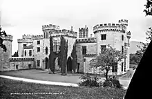 The finest of the dozen country houses that Nash designed as picturesque castles include the relatively small Luscombe Castle Devon (1800–04),[30] Ravensworth Castle (Tyne and Wear) begun 1807 only finally completed in 1846, was one of the largest houses by Nash,[31] Caerhays Castle in Cornwall (1808–10),[32] Shanbally Castle, County Tipperary (1818–1819) was the last of these castles to be built.[33] These buildings all represented Nash's continuing development of an asymmetrical and picturesque architectural style, that had begun during his years in Wales, at both Castle House Aberystwyth and his alterations to Hafod Uchtryd.[34]