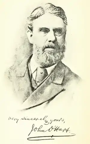 John O'Hart (1824–1902) was an Irish genealogist. He was born in Crossmolina, County Mayo, Ireland. A committed Roman Catholic and Irish nationalist, O'Hart had originally planned to become a priest but instead spent two years as a police officer. He was an Associate in Arts at the Queen's University, Belfast. He worked at the Commissioners of National Education during the years of the Great Famine. He worked as a genealogist and took an interest in Irish history. He died in 1902 in Clontarf near Dublin, at the age of 78.