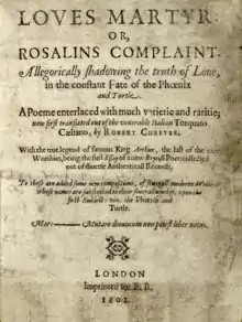 Salusbury also seems to have been acquainted with Ben Jonson, who may have been the person responsible for organising a group of important poets to contribute verses to supplement Chester's poems. Among these were Jonson himself, John Marston, George Chapman and William Shakespeare, who contributed The Phoenix and the Turtle.[10] These poems share the imagery of Love's Martyr and Salusbury's typical elusive and complex allegorising.