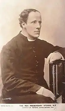 Storrs was ordained deacon in 1871 and a priest in 1873. He was a curate at St Mary's Bury St Edmunds.[5] and then at St Peter's, Eaton Square, London. From 1880 he was the vicar of St James' (now St Edmundsbury Cathedral), Bury St Edmunds and, from 1883, at St Peter's, Eaton Square before becoming the Dean of Rochester in 1913. Whilst at St Peter's he served as the rural dean[lower-alpha 1] from 1891 to 1902, then was the Rural Dean of Westminster from 1902 until his move to Rochester. In 1912 and 1913 he was an honorary chaplain to King George V.[4]