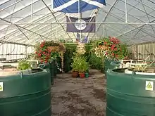 The first "Living Machine" was created at Findhorn Ecovillage in Moray, Scotland in 1995.[3] For its design, John Todd drew on the work of Käthe Seidel and H.T. Odum.[3] The system had to accommodate wastewater from an ongoing population of about 300 residents, and a seasonally fluctuating population of as many as 10,000 visitors per year.[19] The resulting installation resembles a tropical conservatory garden. Every organism provides food for the next step in the food chain until the cycle is complete.[3]