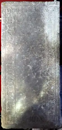 The bell measuring about 18 inches in diameter, was made in 1539 by Aelbert Hackman in the Duchy of Cleves in the Holy Roman Empire. It is the oldest bell in Devon to bear a date in its inscription. The engraved inscription between two decorative friezes reads as follows: "In the year 1539 Aelbert Hackman cast me in Cleve. Jesus, Mary, Ann".[13] This was therefore one year before Anne of Cleves became the fourth wife of King Henry VIII.