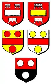 - c) Or, a fess gules, between three torteaux