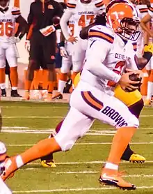 Manziel was drafted by the Browns as the 22nd overall pick of the 2014 NFL Draft. Despite some success, he struggled with consistency and his tenure was overshadowed by off-field controversies.[8][9][10][11] He was released by the Browns after the end of the 2015 season. Following further controversies during the 2016 offseason,[12][13][14] Manziel was not signed by another team before the start of the season and spent two years away from football until he returned with the Canadian Football League’s Tiger-Cats in 2018. He was later traded to the Alouettes during the season, but was released the following year and rendered ineligible to play in the CFL after it was determined he violated the terms of his contract. Shortly after his release, Manziel signed with the Express during the AAF's inaugural season, which was cut short when the AAF suspended operations two weeks later.