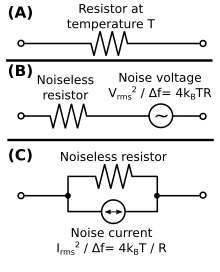where Δf is the bandwidth in hertz over which the noise is measured. For a 1 kΩ resistor at room temperature and a 10 kHz bandwidth, the RMS noise voltage is 400 nV.[6] A useful rule of thumb to remember is that 50 Ω at 1 Hz bandwidth correspond to 1 nV noise at room temperature.