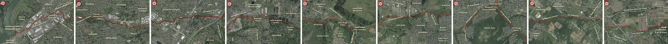 For much of its course, the creek flows at almost right angles to the numbered avenues of southeast Portland and its eastern suburbs. As the creek descends, so do the avenue numbers. The creek begins in uplands in Clackamas County east of Southeast 362nd Avenue and flows swiftly to the west for about 5 miles (8 km), crisscrossing the border between Clackamas County and Multnomah County 5 times in this upstream stretch, and passing under U.S. Route 26, the Mount Hood Highway, in Multnomah County at about 20 miles (32 km) from the mouth. Shortly thereafter, it receives Badger Creek and Sunshine Creek from the left and the North Fork of Johnson Creek from the right.[5][6]