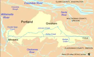 Johnson Creek begins near the unincorporated community of Cottrell in Clackamas County, Oregon, southeast of Gresham in the foothills of the Cascade Range, and flows generally westward about 25 miles (40 km) to its confluence with the Willamette River, a major tributary of the Columbia River.[2][5][6] The creek passes through the cities of Gresham, Portland, and Milwaukie and crosses the border between Clackamas County and Multnomah County eight times.[5][6]