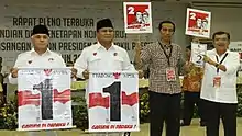 His running mate was not revealed until 19 May, when Jokowi declared that would be running with former vice president and 2009 presidential candidate Jusuf Kalla (JK). Supporting them initially was a coalition of four political parties: Indonesian Democratic Party of Struggle (PDI-P), Nasdem Party, People's Conscience Party (Hanura) and the National Awakening Party (PKB).[23] Golkar, which initially had stated that it would support the pair, switched to support the opposing Prabowo Subianto–Hatta Rajasa ticket shortly beforehand despite Kalla being a former chairman of Golkar.[24] The pair registered to the General Elections Commission (Indonesian: Komisi Pemilihan Umum/KPU) on 19 May, accompanied by politicians such as Puan Maharani and Tjahjo Kumolo.[25]