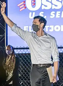 Ossoff ran in the Democratic primary election to try to unseat then-incumbent Republican senator David Perdue in the 2020 Senate election in Georgia.[52] On June 10, Ossoff advanced to the general election by winning 50.5% of the vote, just over the threshold to prevent a run-off election. In July 2020, Perdue's campaign ran a Facebook advertisement in which Ossoff's nose was digitally altered to be larger, which Ossoff criticized as "one of the most classic anti-Semitic tropes".[53] Perdue's campaign said that Perdue had not seen the image and that the widening and elongation of his nose was done by a vendor.[54] The Perdue campaign pulled the advertisement.[55]