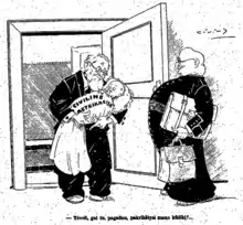 In 1922–1923, Šliūpas taught hygiene and world literature at the Saulė Gymnasium in Biržai and Lithuanian and English literature at the Šiauliai Gymnasium.[171] As an educator, he organized public lectures and attended local meetings of the Lithuanian Evangelical Reformed Church.[172] In early 1924, Šliūpas had a stomach operation in Königsberg. Upon his return, chaplain of the Šiauliai Gymnasium complained that Šliūpas' lessons included anti-religious themes to the Minister of Education Leonas Bistras. Šliūpas was asked to refrain from anti-religious comments, but he resigned and moved to Kaunas.[173] In February 1923, he received honorary doctorates in medicine and history from the University of Lithuania;[a 4] he received the third honorary doctorate in law in 1939.[174] From fall 1924, Šliūpas became a privatdozent and taught history of medicine at the Faculty of Medicine of the University of Lithuania. It was an elective class and not every semester there were enough students to hold it. He resigned after four years and received a government pension.[175] He published his lessons on hygiene and history of medicine as separate books in 1928 and 1934.[176]