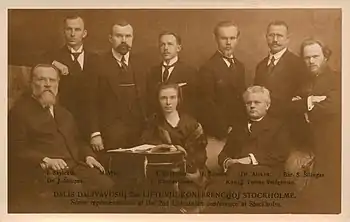 Šliūpas remained in Stockholm until May 1918. During that time he published two political booklets, Lithuanian Lietuvių-latvių respublika ir Šiaurės Tautų Sąjunga (Lithuanian–Latvian Republic and the Union of Nordic Nations) and English Essay on the Past, Present, and Future of Lithuania.[143] He sent memorandums to President Woodrow Wilson about the need to support independence movements of the various nations in the Russian Empire and to British officials urging to recognize Lithuania's independence.[144] Šliūpas also attended the third Lithuanian conference in Stockholm in January 1918. The conference adopted a seven-point demand list to Russia and Germany to recognize independent Lithuania, repay war damages, withdraw their armies, include Lithuanian representatives in any peace negotiations – the full text of the resolution was reprinted in Essay on the Past, Present, and Future of Lithuania.[145]