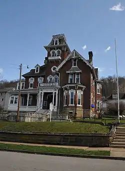 Jonathan M. Bennett House, also known as Louis Bennett Public Library, is a historic home located at Weston, Lewis County, West Virginia. Its name reflects its builder, Jonathan M. Bennett, who represented Lewis County in the Virginia General Assembly and served as state auditor before the American Civil War. Bennett was a prominent local lawyer and businessman, who was allowed to hold office in West Virginia following its adoption of a new state Constitution in 1872.[2] He built this house in 1874–1875; the 17-room mansion reflects the High Victorian Italianate style. It features a 4 1⁄2-story entrance tower with a mansard roof. It also has heavy wooden brackets on the tower and verandah, a balustraded tower balcony, and an elaborate bargeboard. it was left by Mrs. Louis Bennett, Sr., in 1922 to the citizens of Lewis County as a public library and community center.[3]