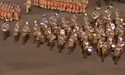 The Jordanian Armed Forces Band (Arabic: فرقة القوات المسلحة الاردنية) is the main musical unit of the Royal Jordanian Army made up of musicians who perform in official settings usually in the presence of the Jordanian royal family. When performing, all band members wear red and white checked Keffiyehs alongside their full dress uniform.[1] The band was established in 1921, with a core of 10 musicians who served with the Arab Army. In 1929, bagpipes from the area that is now Egypt and Syria were first introduced to the band.[2] In 1982, Hussein of Jordan approved the use of the band for purely ceremonial purposes. Today, the full band is composed of over 500 musicians who are arranged in a similar fashion to the Bands of the Household Division.[3][4][5][6][7]