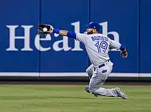 Bautista finished the 2015 regular season with a .250 batting average, 40 home runs, and 114 RBI. He also walked more than he struck out for the second consecutive year, totaling 110 walks to 106 strikeouts. For the season, he had the lowest line drive percentage of all major league hitters (13.9%).[90] From 2010 to 2015, he batted .268 with 153 doubles, 227 home runs, 582 RBI, 574 walks, 576 strikeouts, .390 OBP, .555 SLG, .945 OPS, and 156 OPS+.[15] In that span, he hit more home runs than any other major leaguer – 28 ahead of second-place Miguel Cabrera[91] – was second in slugging percentage[92] and walks,[93] third in OPS[94] and OPS+[95] and fifth in OBP.[96]
