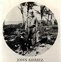 John Gómez (also known as Juan Gómez and Panther John) was a real person who has become entangled with the legend of José Gaspar. In the late 1800s, Gómez lived in a shack with his wife on otherwise uninhabited Panther Key, a small island near Marco Island in the Ten Thousand Islands region of Southwest Florida. He was well known along Florida's Gulf coast as an expert hunting and fishing guide, boat pilot, and an eccentric teller of tall tales, mostly about himself.[20] His self-reported age and birthplace varied, even on official documents. In the 1870 United States Census, he is listed as having been born in 1828.[21] However, during the 1880 US census, Gómez claimed to have been born in France in 1785.[22] In 1885, he told state census takers that he had been born in Corsica,[23] and reported to the 1900 US Census that he was born in Portugal in 1776.[24] Meanwhile, various contemporary letters and news articles report that Gómez claimed at different times to have been born in 1778, 1781 or 1795 in Honduras, Portugal, or Mauritius.[20][25][21] Most of his supposed birth years would have likely made him the oldest person in the world before his death.[1]