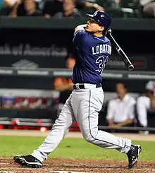 Lobaton hit his first Major League home run against the Baltimore Orioles on July 25, 2012.[2] During a three-game series against the Toronto Blue Jays from August 16–18, 2013, Lobaton hit a walk-off triple[3] and walk-off home run,[4] becoming the first catcher to do so since Wally Schang in 1917 and only the fourth player overall since 2002.[5]