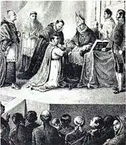 Morelos had ambitions for something more than working with his hands, and assiduously studied; his maternal grandfather was a school teacher.[5] In 1789, he enrolled in the Colegio de San Nicolás Obispo in Valladolid, where Father Miguel Hidalgo y Costilla was rector.[5] When he was ordained a priest, he, as with many others without connections, had no benefice to guarantee any income as a priest.[5] However, since he was a secular cleric and therefore took no vow of poverty, he could freely pursue business activities to make a living.[5]