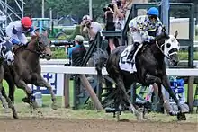 In 2017, Ortiz earned his first win in a Triple Crown race with Tapwrit in the Belmont Stakes. He was again the leading rider at Saratoga, highlighted by a victory on Elate in the Alabama Stakes.[12] He won the Breeders' Cup Juvenile aboard Good Magic and finished the year as the leading jockey in the United States by earnings. He was voted the Eclipse Award for Outstanding Jockey.[13] José Ortiz was on Good Magic during the Kentucky Derby and was spotted with a "Free Murdoc" strip on his leg. He later went on to come second.