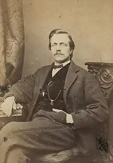 In August 1868 Parry and his family arrived in England, where he began a three-year study at the Royal Academy of Music under William Sterndale Bennett and Manuel Garcia.[7] During his last year of study at the Royal Academy, Parry appeared before Queen Victoria three times, each time by her special request. The Queen made another request of Parry each time he appeared: that he perform only works he had composed.[10] In 1871, Bennett convinced Parry to enter University of Cambridge for a degree in music.[7][17][lower-alpha 4] While at Cambridge, Parry became the first Welshman to take both the MusB and MusD there.[1] After earning his bachelor's degree, Parry and his family returned to Danville, where he operated a school of music for the next three years.[7][18] When Aberystwyth University established a chair for music, it was offered to Parry; he moved his family back to Wales, becoming the university's first Professor of Music.[7][19][1][lower-alpha 5]