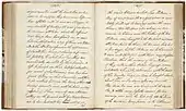 Clark's journal covers the First Fleet voyage and the first few weeks in New South Wales. It is held by the State Library of New South Wales and covers the period from 9 March 1787 to 10 March 1788. It lists all convicts aboard the 'Friendship', including the date when each was received on board, name, trade, crime, sentence, when and where they were tried, county, and place of birth. Clark's journal gives an insight into his view of the convict women who he refers to as "damned whores" and "abandond wreches [sic]".[30] His journal is of a very personal nature and makes constant reference to his 'beloved Betsy' and son Ralph, who he greatly missed.[30] Clark's journal has only three entries for March 1787, and no further entries until 13 May 1787.[28] His complete journal also covers later periods and is in four volumes, which includes his visit to Norfolk Island and his voyage on Gorgon returning to England.[30] The four volumes cover the following time periods: 9 March 1787 – 31 December 1787, 1 January 1788 – 10 March 1788, 15 February 1790 – 2 January 1791, and 25 January 1791 – 17 June 1792.[30] His journal and letterbook have also been published,[28] transcribed and digitised.[30]