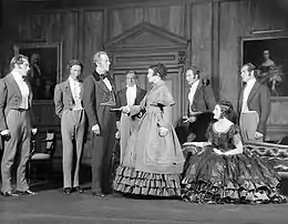 During the Second World War, Carey toured with John Gielgud for the Entertainments National Service Association (ENSA) bringing theatre to members of the armed forces at home and abroad, recreating some of her roles from Tonight at 8.30. In 1942 she rejoined Coward to tour in his three newest plays, This Happy Breed as Sylvia, Blithe Spirit as Ruth, and Present Laughter as Liz – a character based partly on the actress herself.[3] She later played all three roles in London. After the war she played in new Coward plays, Quadrille (with Alfred Lunt and Lynn Fontanne) and Nude with Violin (with Gielgud in London and Coward in New York).[1][2]