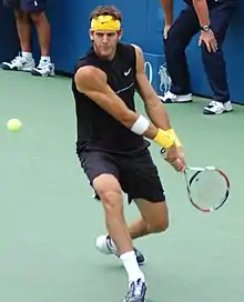 Del Potro's good form carried over into the new year as he reached his second successive Grand Slam singles quarterfinal at the Australian Open, losing to world No. 2 and eventual runner-up Roger Federer. In June of the same year, del Potro reached his first Grand Slam singles semi-final at the French Open, where he once again lost to the world No. 2 and eventual champion, Roger Federer, this time in five sets.[2] This marked the first time that del Potro had taken a set from Federer.[3] In August, del Potro reached his first ATP Masters Series singles final at the Rogers Cup in Canada, losing to Andy Murray in three sets.[4] Later that year, del Potro reached his first US Open final by defeating then-world no. 3 Rafael Nadal in the semi-finals in straight sets.[5] Del Potro went on to win his first Grand Slam singles title by defeating world no. 1 and five-time defending champion Roger Federer for the first time in his career, prevailing in five sets. In November, del Potro lost to Nikolay Davydenko in the final of the ATP World Tour Finals in straight sets.[6]