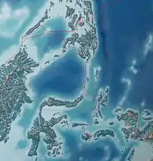 Elcano served as a naval commander of the emperor Charles V, and took part in the expedition to the Philippines. In 1519, this 241-man expedition set sail with five ships, Trinidad, Concepción, San Antonio, Santiago, and Victoria. Elcano participated in a fierce mutiny against Magellan before the convoy discovered the passage through South America, the Strait of Magellan. He was spared by Magellan and after five months of hard labour in chains was made captain of the galleon.[7] Santiago was later destroyed in a storm. The fleet sailed across the Atlantic Ocean to the eastern coast of Brazil and into Puerto San Julián in Argentina. Several months later they discovered a passage now known as the Strait of Magellan located in the southern tip of South America and sailed through the strait. The crew of San Antonio mutinied and returned to Spain. On 28 November 1520, three ships set sail for the Pacific Ocean and about 19 men died before they reached Guam on 6 March 1521. Conflicts with the nearby island of Rota prevented Magellan and Elcano from resupplying their ships with food and water. They eventually gathered enough supplies and continued their journey to the Philippines and remained there for several weeks. Close relationships developed between the Spaniards and the islanders. They took part in converting the Cebuano tribes to Christianity and became involved in tribal warfare between rival Filipino groups in Mactan Island.