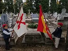 In Spanish popular discourse de Mella is moderately present, usually referred to as a political theorist,[282] at times denounced as co-responsible for reactionary, anti-democratic, shameful past.[283] In 1994 there were calls to restore the plaque in his honor, mounted in 1928 and since then destroyed with the Paseo del Prado 14 house he lived in.[284] In 2016 Plaza Vázquez de Mella was renamed to honor homosexual rights activist and PSOE councillor Pedro Zerolo;[285][286] in the accompanying debate the insults of "Fascists", "Francoists" and "homophobes" were used to describe de Mella and his supporters.[287] Initiators of the motion claimed they collected 84,000 electronic signatures in support.[288][289] A number of cities in Spain still maintain street names honoring de Mella.[290]