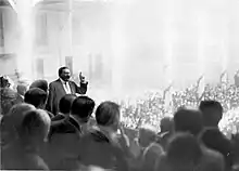 Most of his contemporaries were impressed not with de Mella's writings, his thought or leadership style, but rather with his oratorical skills.[237] This applies to both young men[238] and experienced statesmen; it is often quoted that when listening to a then unknown de Mella in the Cortes, Antonio Cánovas mumbled in amazement: "¿Quién es ese monstruo?"[239] De Mella exercised hypnotic effect on huge public gatherings[240] and limited audiences alike; it is not infrequent to find reports of listeners brought by his addresses to the borders of frenzy and hysteria.[241] This was so despite the fact that de Mella was not gifted with impressive posture: mid-height, tending to overweight and lacking a mesmerizing voice, he used to transform when taking the floor. It is recorded that each his address was a great show: body language of eye movement, head movement, gestures and steps combined with master command of verbal communication[242] bestowed upon him "a majesty of a lion".[243] Some scholars consider de Mella one of the greatest speakers of Spanish parliamentarism.[244] However, his harangues were not shows only; many of de Mella's addresses were printed as booklets. It is not clear whether in general he was improvising or rather coming with at least a sketch of the text pre-prepared; as a huge number of his addresses were reconstructed on basis of his private papers,[245] it seems that the latter was the case. Most of the addresses published are in range of some 500–800 words,[246] which would make less than 10 minute speech. Some are up to 1,600 words,[247] requiring attention of a listener for slightly less than half an hour. There are scholars who make veiled references to Hitler and Mussolini, claiming that de Mella represented a new type of charismatic public speaker compared to old-style 19th century leaders.[248]