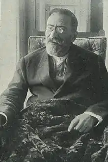 Since the early 1900s[252] de Mella enjoyed a popular standing nationwide among Conservatives,[253][254] he grew into an iconic figure among the Spanish Traditionalists, disregarded by the foreign ones.[255] Among Republicans and Liberals he was ridiculed as an apostol of outdated, medieval ideas.[256] When a retiree he featured in the press as a point of reference,[257] many reviews publishing huge all-page photos following the news of his death.[258] Former Mellistas ensured that soon afterwards a commemorating plaque was mounted in Madrid.[259] In the early 1930s most faithful disciples[260] edited a monumental series of de Mella's works.[261] For the progressists he was already a ludicrously prehistoric voice from "ultratumba".[262]