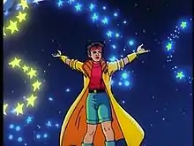 Jubilee finds a home with the X-Men and joins the X-Men Blue Team.[15] She aids her fellow mutants in battles against Omega Red, the Shi'ar Empire, Skrulls, and the Brood, among others. With the last three, she holds her own against many powerful entities, often being the vital factor in saving fellow X-Men and/or innocent civilians. She forms close bonds with many of the team members, taking piggyback rides with Beast as she enjoys his leaping abilities. When Professor Xavier temporarily regains the use of his legs, she takes him rollerblading.[16] She has the chance to talk about Wolverine with Shadowcat, who had been in her sidekick role before, and bonds with the younger Illyana Rasputin. Jubilee later mourns the loss of Illyana with the rest of the X-Men, especially Jean Grey.[17]