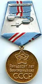 The Jubilee Medal "50 Years of the Armed Forces of the USSR" (Russian: Юбилейная медаль «50 лет Вооружённых Сил СССР») was a state military commemorative medal of the Soviet Union established on December 26, 1967[1] by decree of the Presidium of the Supreme Soviet of the USSR to denote the fiftieth anniversary of the creation of the Soviet Armed Forces. Its statute was amended on three occasions, by decrees of the Presidium of the Supreme Soviet of the USSR of February 22, 1968,[2] of December 19, 1969,[3] and of July 18, 1980.[4]