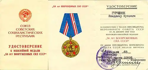 The Jubilee Medal "50 Years of the Armed Forces of the USSR" was awarded to marshals, generals, admirals, officers and warrant officers, sergeants, soldiers and sailors in the service on February 23, 1968 as part of the Soviet Army, Navy, troops of the Ministry for Public Order of the USSR, the troops of the Committee for Public Safety of the USSR, the Council of Ministers of the USSR; cadets and students of military educational institutions of the Soviet Army, Navy, of the troops of the Ministry for Public Order of the USSR, of the troops of the State Security Committee; marshals, generals, admirals and officers discharged from active military service, in the reserve or retired that have seniority in the Soviet Army, Navy, in troops of the Ministry for Public Order of the USSR, in the army or state security organs, in the Council of Ministers of the USSR, of 20 or more years; Heroes of the Soviet Union and individuals awarded the Order of Glory in all three classes.[1]