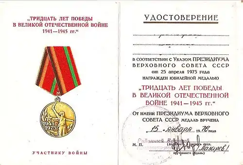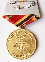 The Jubilee Medal "Thirty Years of Victory in the Great Patriotic War 1941–1945" (Russian: Юбилейная медаль «Тридцать лет Победы в Великой Отечественной войне 1941–1945 гг.») was a state commemorative medal of the Soviet Union established on April 25, 1975 by decree of the Presidium of the Supreme Soviet of the USSR[1] to denote the thirtieth anniversary of the Soviet victory over Nazi Germany in World War II.