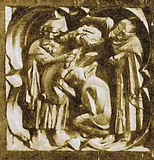 On the back of the Shrine of the Three Kings (1190–1225) is a scene, which shows the flagellation of Jesus Christ by two henchmen with Jewish hats. It is interpreted not because of the hats, but because of the caricature-like macking faces of the henchmen. It is probably one of the first examples of overemphasised Jewish noses as an anti-Jewish stereotype.[12]