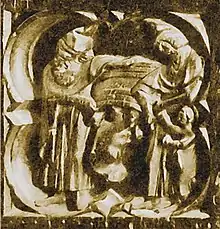 The quatrefoil on the right hand side shows two Jews, who empty a tub, out of which a slaughtered pig and three piglets fall. The Jew on the right hand side leads a young boy to the scene, who can be distinguished as Christian because of a hint of a halo.[9][10]