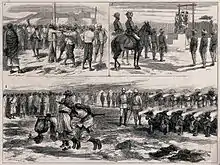 Punishments in camps during the Afghan wars, including flogging, hanging and the shooting of Afghans while tied to a rod. Wood-engraving after Godefroy Durand.