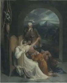 Presumably Charles the Bald was going to arrange another marriage for his daughter. Some historians have argued that neither Judith's first nor second marriage was consummated. There are also claims, more similar to legend, that the future count of Flanders, Baldwin (who according to tradition, would be the son of forester called Odoacre[15]), became interested in Judith even before her first marriage.[16] But, most likely, Baldwin met Judith in 861, when he visited the monastery of Senlis; the Encyclopedia Britannica claims that Baldwin fell in love with the Wessex dowager queen during this visit.[17] Around Christmas 861[18] (or early 862[6]) Judith either fled with Baldwin, or was kidnapped by him. According to the Annales Bertiniani, Judith was not abducted at all: there she is depicted not as the passive victim of bride theft but as an active agent, eloping at the instigation of Baldwin and apparently with her brother Louis the Stammerer's consent:[18]