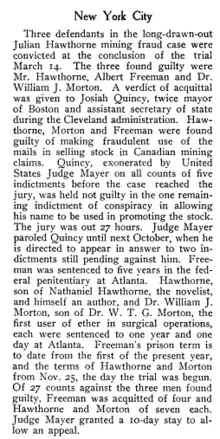In 1908, Hawthorne's old Harvard friend William J. Morton (a physician) invited Hawthorne to join in promoting some newly created mining companies in Ontario, Canada. Hawthorne made his writing and his family name central to the stock-selling campaigns. After complaints from shareholders, both Morton and Hawthorne were tried in New York City for mail fraud, and convicted in 1913.[20] Hawthorne was able to sell some three and a half million shares of stock in a nonexistent silver mine and served one year in the Atlanta Federal Penitentiary.[21]