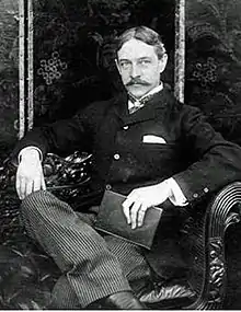 Throughout the 1880s, Sir Arthur Sullivan chafed at the restrictions of the comic operas for which he was famous. His friends and associates, and even the queen, encouraged him to write a serious opera.[15] His usual collaborator, W.S. Gilbert, declined to join him in writing a full-scale romantic opera, and recommended Sturgis as "the best serious librettist of the day".[16] The opera, Ivanhoe (1891), is an adaptation of Walter Scott's long patriotic novel of the same title. Most critics praised the libretto. Bernard Shaw was an exception, accusing Sturgis of "wanton debasement of a literary masterpiece", turning "Scott's noble dialogue" into "fustian".[17][n 5] The Times praised Sturgis's "remarkable fidelity and skill".[19] The Observer also found his work skilful.[20] The Manchester Guardian said that Sullivan was fortunate in his librettist, who "show[ed] himself capable of depicting ideas and events in a few words, and those words replete with rhythmical vigour and poetic beauty as well as significance of meaning."[21] Sullivan's friend the critic Herman Klein called the libretto "a skilful and fairly dramatic adaptation of Scott's novel and a polished example of poetic lyric-writing".[22] Although the opera was a success, initially running for an unprecedented 155 performances at Richard D'Oyly Carte's new Royal English Opera House, it passed into obscurity after the opera house failed.[23] It was, Klein observed, "the strangest comingling of success and failure ever chronicled in the history of British lyric enterprise!"[22]