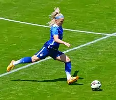 On April 14, Ertz was named to the 23-player roster that would represent the United States at the 2015 FIFA Women's World Cup.[51] She was one of the five United States players that played every minute in all seven matches for the United States during the World Cup.[52] In the 59th minute of the team's semi-final match against Germany on June 30, Ertz pulled down opposition player Alexandra Popp inside the penalty box and was given a yellow card. Celia Sasic took the subsequent penalty kick but missed the net. The United States went on to win the match 2–0 to advance to the World Cup final.[53] In the final, the United States faced Japan on July 5. In the 52nd minute, Ertz attempted to block a free kick but instead scored an own goal. However, the United States still went on to win the match and the World Cup title.[52] Following the tournament, Ertz was named to the FIFA Women's World Cup All-Star Team.[5] She joined the national team on a Victory Tour following their World Cup win that started in Pittsburgh, Pennsylvania on August 16 and ended in New Orleans, Louisiana on December 16.[54][55]