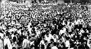 In other universities, students with anti-Japanese consciousness started to fight against Japan by burning Flag of Japan and Prime Minister of Japan scarecrows.[3] At that time, Seoul National University's Nationalist Comparison Research Society played a leading role, and it was possible because there was a communication network of activist students nationwide.[4] The protests spreabeyond hunger strikes to street protests, and college students, citizens and opposition parties took to the streets carrying the national flag, shouting, "The pro-Japanese Park Chung-hee regime should withdraw its diplomatic normalization with Japan," "Shame on you after 20 years of liberation," and "Stop the government that ignores the people."[5]