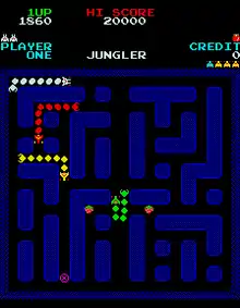 Jungler is an arcade maze game developed by Konami and released in 1981. Distributed by Stern in the United States beginning in 1982,[1] the game has players controlling a multi-segmented creature attempting to destroy similar enemy creatures by either shooting them or eating them.