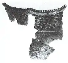 11 sherds representing a single vessel were present at Juntunen.[4] Ramey Incised is a Middle Mississippian pottery type first identified at the Cahokia Old Village site in southern Illinois. It has also been recovered at Carcajou Point in Wisconsin, but its presence at Juntunen marks the northernmost occurrence of any Middle Mississippian pottery type. Tempering is shell-tempered mixed with grit and decoration is a distinctive pattern of curvilinear designs. The vessel shape is thought to be a bowl with sharply defined shoulder. It was recovered in intermediate strata between the Bois Blanc and Juntunen Phases.[4][13]