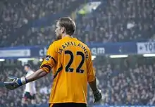 In October 2006 he saved two penalties in one match from Blackburn Rovers' Benni McCarthy and Jason Roberts to secure a 1–0 away win.[4] On 13 May 2007, Jääskeläinen received Bolton's "Player of the Year Award" and also the "Players' Player of the Year Award" after helping Bolton secure a UEFA Cup spot for only the second time in their history.[5] Despite much speculation linking him with a move away from Bolton when his contract expired following the 2007–08 season, Jääskeläinen agreed a new four-year contract on 11 June,[6] which he signed on 9 July.[7]