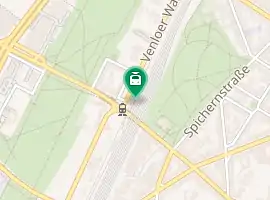 Köln West (Cologne West) station is located in the northwestern edge of the Innenstadt of Cologne in the district of Neustadt-Nord in the German state of North Rhine-Westphalia. It is located on Venloer Straße (street). The station is a stop for regional services on the Cologne ring railway (part of the West Rhine Railway). It is also served by lines 3, 4 and 5 lines of the Cologne Stadtbahn, which run through the Hans-Böckler-Platz/Bf. West underground station. The surface station has two platform tracks on a 303-metre-long island platform[5] and eight tracks without platforms, which are used by intensive freight traffic.