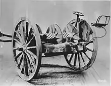 The K-1 cart is a wire cart type K-1. It comprises a 2-wheel reel cart used for the rapid laying and recovering of telephone and telegraph lines in the field. It is completely equipped with a reel, mechanically rotated and controlled, 1 chest with wire-laying equipment, a driver's seat, and appropriate parts and fittings specially designed and used for only on this cart; designed to carry 5 miles of wire, type W-39. It was formerly known as "Wire reel cart, type N".[1]